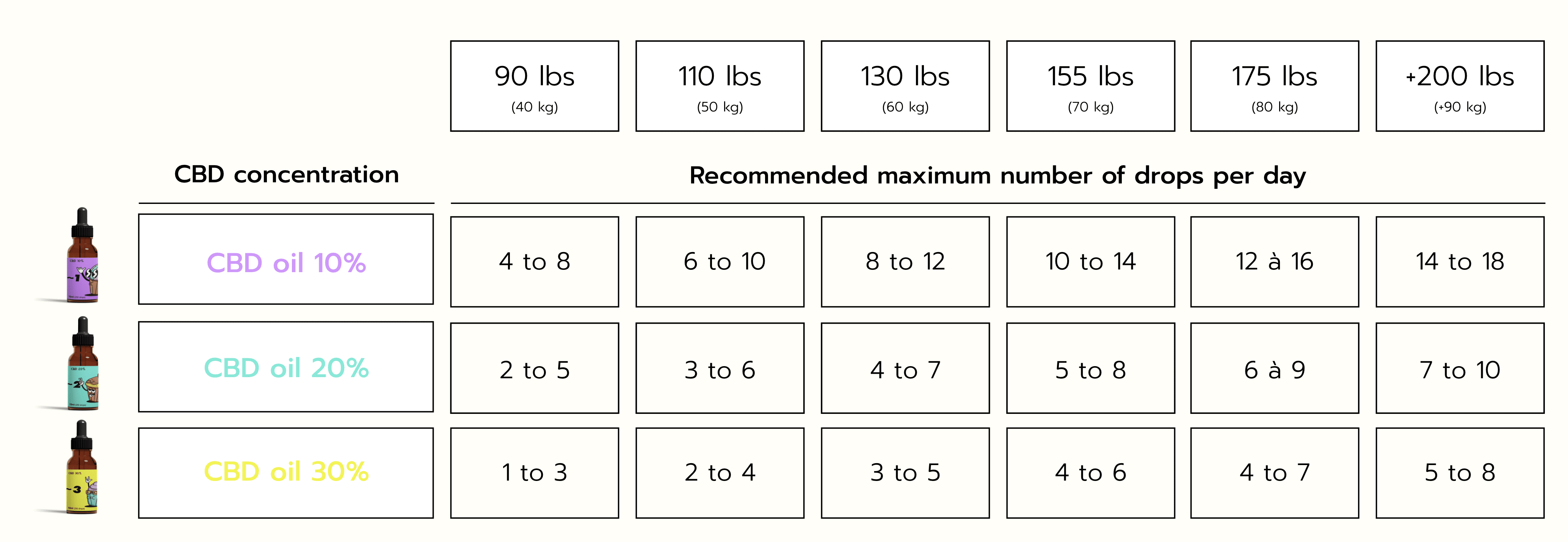 This table is not a dosage. It presents dosage recommendations that may not be right for you. Before starting to consume CBD, we recommend that you consult your doctor so that he can best advise you on your personal needs and possible cross-effects with other medications.