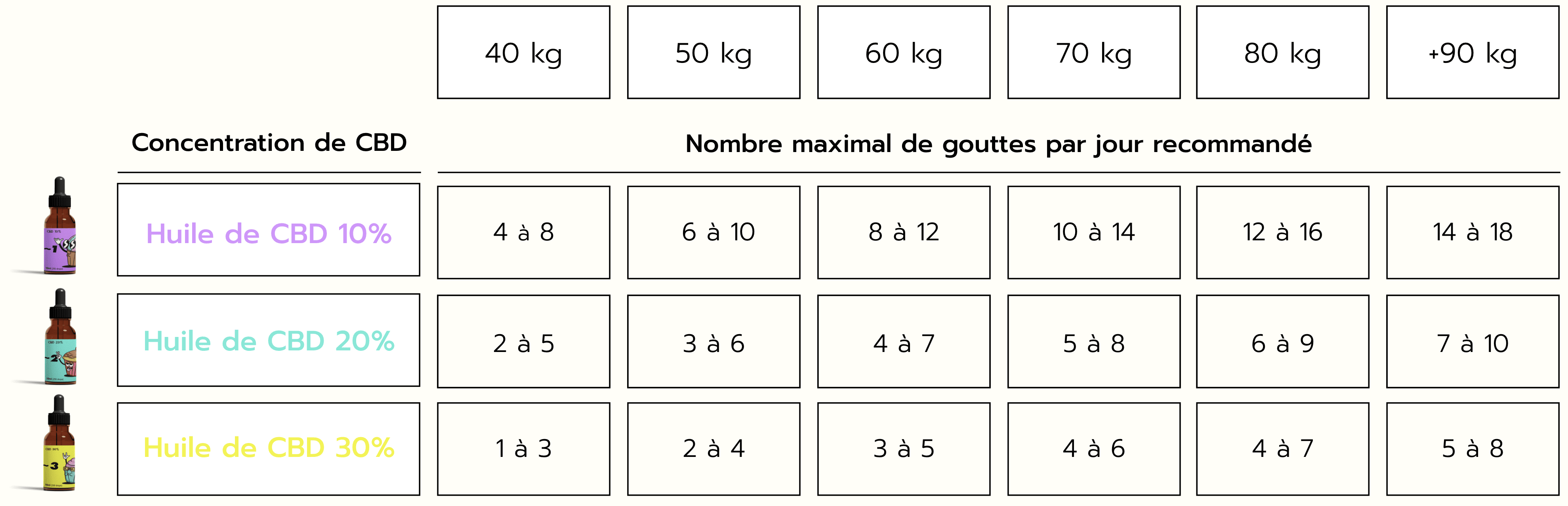 Ce tableau n’est pas une posologie. Il présente des recommandations de dosage qui ne vous correspondent peut-être pas. Avant de commencer à consommer du CBD, nous vous recommandons de consulter votre médecin afin qu’il vous conseille au mieux sur vos besoins personnels et les éventuels effets croisés avec d’autres médications.
